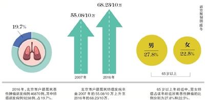 北京市腫瘤防治研究辦公室副主任王寧介紹,上世紀七十年代起,肺癌就位居北京居民惡性腫瘤發病、死因第一位。監測表明,八成以上的男性患者都有20年以上的吸煙史,二手煙也是肺癌的主要致病因。此外,遺傳因素占到5%左右。